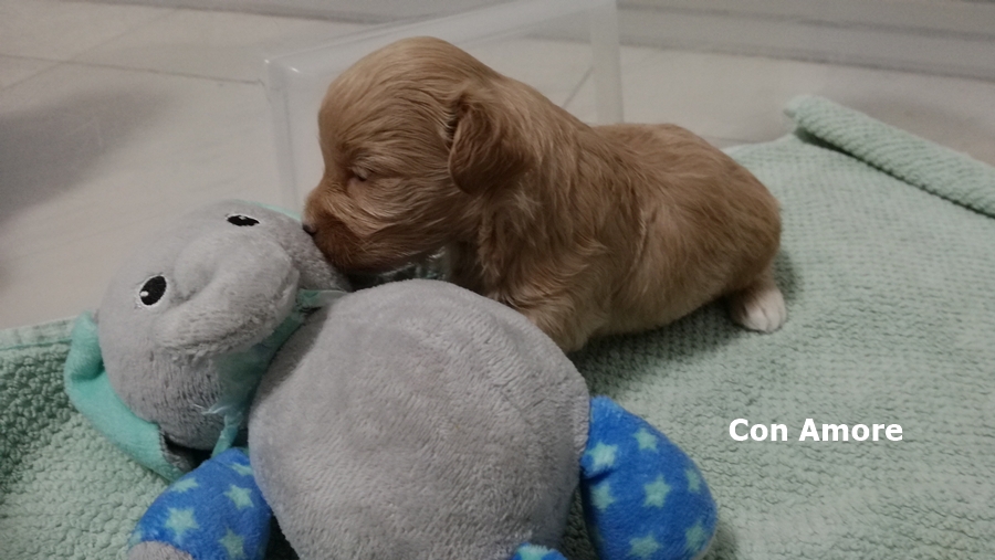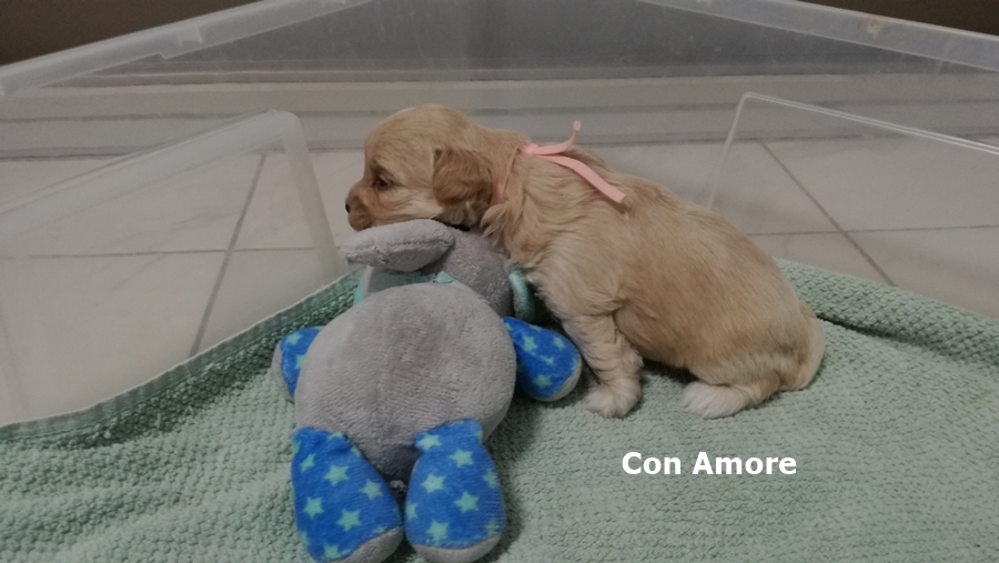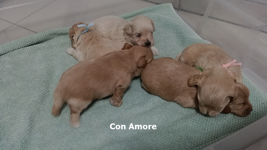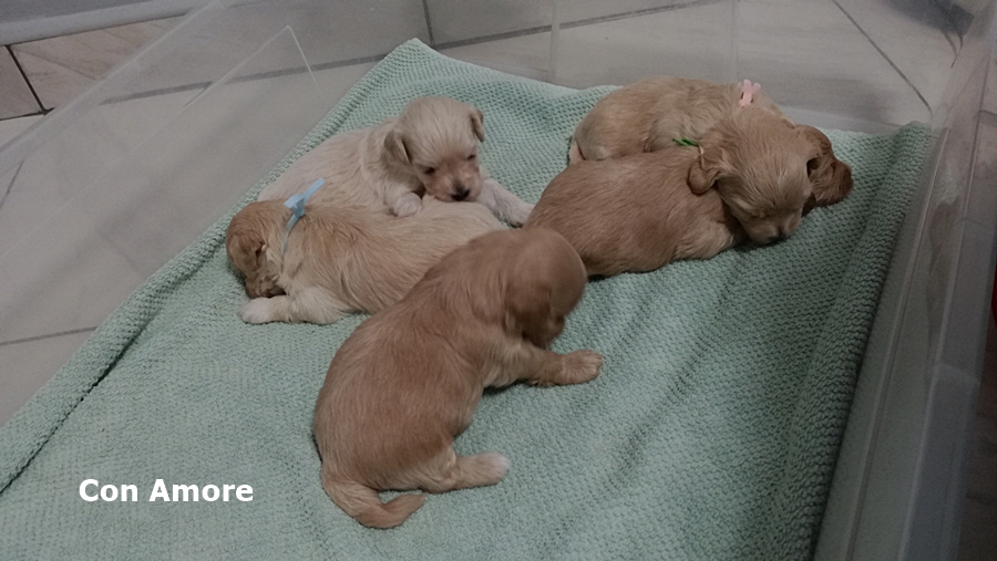 W czwartym tygodniu życia szczenięta uczyły się chodzić oraz jeść moczoną karmę. Zauważyły również zabawki. Kolorowe znaczniki zakładane tylko na potrzeby filmików powodują swędzenie, dlatego szczenięta drapią się po szyjach. Gdy dostaną znaczniki na stałe, przyzwyczają się.